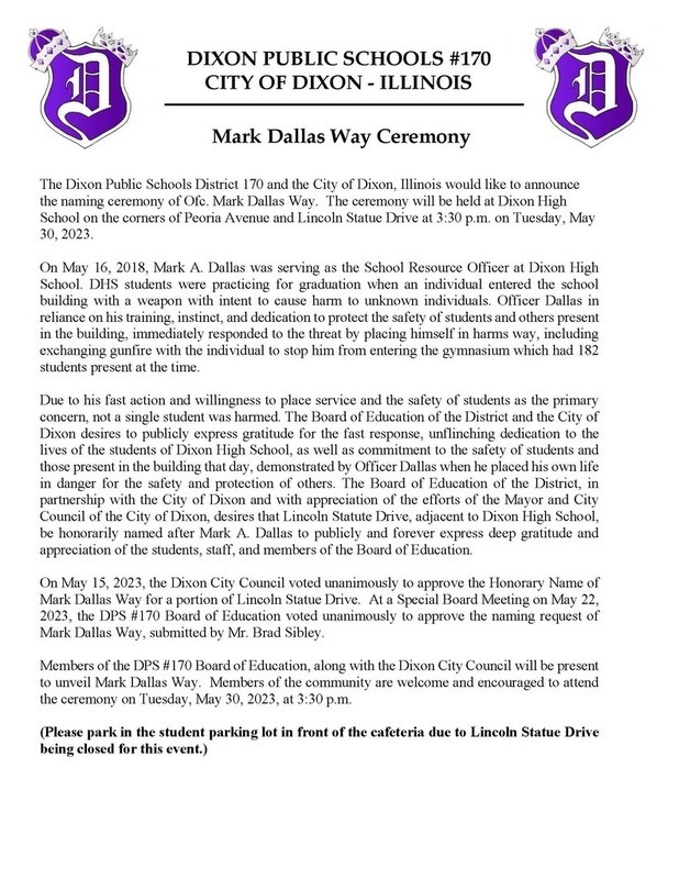Dixon High School was proud to host the Mark Dallas Way Ceremony on May 30th, 2023, where Lincoln Statue Drive in front of the high school was honorarily named after Mark A. Dallas. Se below for details on the event. Video highlights from the ceremony are posted on Youtube: