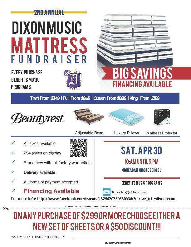 The Dixon Music Program will be having their 2nd Annual Mattress Sale Fundraiser on Saturday, April 30th from 10am- 5pm at Reagan Middle School. Last year, the band was able to raise $3,860. This year they hope to match or beat that number. All funds will be going to replacing old equipment/instruments for Reagan Middle School.
